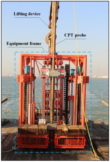 In order to determine accurate geological conditions and soil classification in the north of the Yellow River Subaquatic Delta, ten stations were arranged, of which one is perpendicular to the coastline, two others are parallel to it, as shown in Figure 1. The independently-developed Submarine Engineering Geological Environment Investigation System (SEGEIS) carried out a one-month CPT survey—as shown in Figure 2.