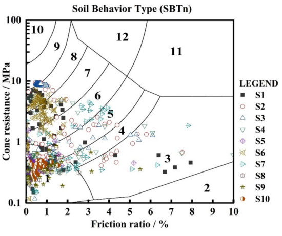 Soil classification charts have been used widely to assess soil behavior based on CPT results [22,23]. The soil classification chart [21] is divided into twelve zones in order to represent the different grain size distributions, as well as the different soil states or behaviors coded by numbers. For example, Zone 1 indicates a soil type of sensitive fine grains, while the CPT data points of classical stiff fine-grained soil will fall in Zone 11, according to Figure 3, as given by Robertson [21].