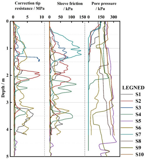 The pore water pressure is distributed in 150 kPa–200 kPa, and the different sites vary significantly in depth. The pore water pressure will drop steeply at a certain depth. As such, the excess pore pressure shows a decreasing trend near 150 kPa–200 kPa in 0.5 m, at 3.4 m depth below from the surface for S9 and 2.1 m depth below for S4. At 4.5 m, it drops by about 140 kPa in S5. There is a high negative pore pressure in the case of high-density fine sands and dilative silts according Cai et al. [23]. Affected by the over-consolidation state, the pore water pressure may also become small or even negative [26].