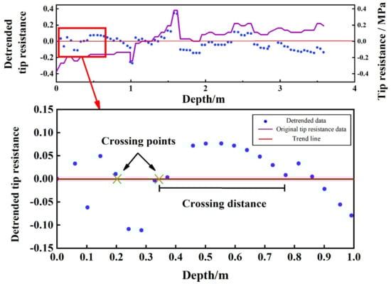 The value after detrending ranges from −1 to 1. The crossing point and crossing distance are shown in Figure 6; the scale of the fluctuation-normalized coefficient of coefficient variation (COV) is defined as SNC, which will indicate the variety of the soil layers. Furthermore, the area of one side of the trendline will indicate the value of the scale of fluctuation (SF), which represents the variety of the soil layers. Although the cone penetration test method suffers a measurement error [30] when the soil layer thickness is small, the influence of the layer thickness on the variability is not significant. Therefore, the error of the cone penetration test in the case of a minimal-thickness soil layer is ignored in this paper.