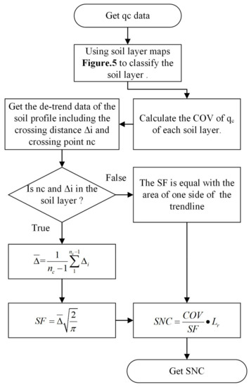 By considering that the intra-layer variability index is affected by COV and SF, a new parameter—SNC—is defined. The variation index of intra-layer size has a significant connection with the each-layer soil thickness and the number of soil layers in the entire soil section. First of all, the data obtained from the CPT is used in calculating each soil COV with soil layer maps and different soil type layer classification. Then, the relationship between the data after the detrending process with crossing points is established. The SF value used in this paper has been introduced [31], which relates to the model and the soil type used in the calculation. According to the research, many differences vary from 0.07 m to 4 m in marine or clay soil types regarding the SF value [32]. Finally, the SNC value is found with the formula proposed [33]. Figure 7 clearly illustrates the calculation process.