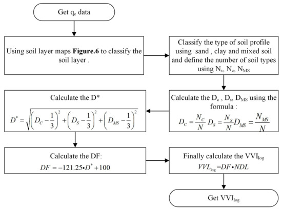 The logarithmic vertical variability index mainly calculates the diversity factors (DF) within a layer. Firstly, the soil layer is classified according to Table 4. The numbers of the sand, clay, and mixed soil obtained are respectively recorded as NS, NC, and NMS. Then, the proportions of the DS, DC, and DMS—of which the sum is 1—are calculated. The D* shown in Figure 8 represents the distance between the soil of any content of the three, and the three of them are 1/3, which is the degree of variation of the three. Theoretically, it fluctuates between 0 and 1, such that the DF ranges from 0 to 100. The lower the DF, the higher the dominance of the soil; therefore, the vertical variability will be smaller. Eventually, the final VVIlog value is obtained. The main steps in the DF and VVIlog are in Figure 9.
