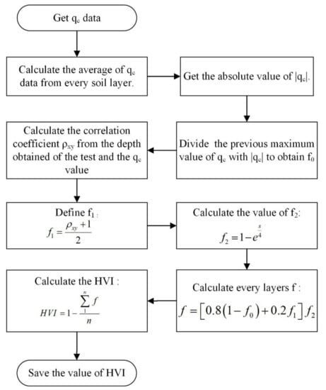 First, the influence factors of qc should be indicated. The differences between qc and the average of qc are calculated. The f0 is defined by dividing the previous maximum value qc with the absolute qc value |qc|. Secondly, the correlation coefficient ρxy between qc and the depth is calculated under the consideration of the depth effect. The parameters of f1 and f2 are figured with the Equations (3) and (4). The eventual HVI value can be calculated using Equation (6). The main calculation process is shown in Figure 10, where ρxy is the correlation coefficient, and s is the vertical distance between the two CPT data points [33].