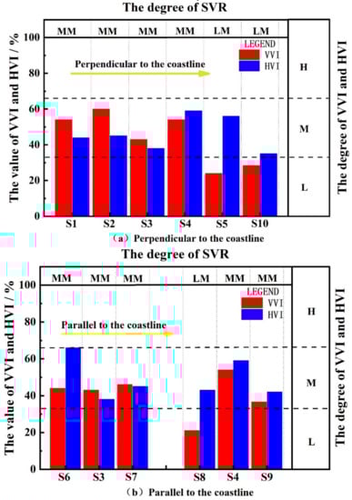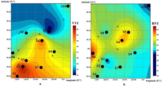 The site variability evaluation and analysis are performed after obtaining the above horizontal variability index and the vertical variability index. The values of the HVI and VVI are divided into three grades of L, M, and H depending on the three criteria of (0–33%), (33–66%), and (66–100%). For the analysis of the horizontal and vertical variability of the entire measurement station, the overall horizontal and vertical variability is high throughout the exploration area.