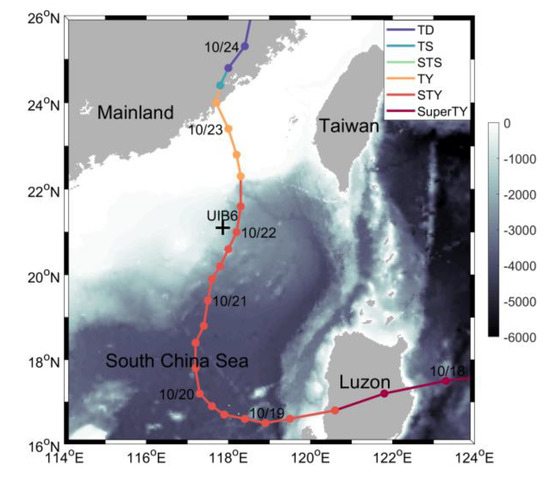 Bathymetry (shading, unit: m) of the northern SCS, track of typhoon Megi (colored lines) and position of mooring UIB6 (black plus). Six-hour positions of Megi’s center are denoted by dots and the time at 00:00 from 19 to 24 October is labeled. Intensity of Megi is represented by various colors, as shown in the legend. TD, TS, STS, TY, STY and SuperTY are abbreviations of tropical depression (10.8–17.1 m/s), tropical storm (17.2–24.4 m/s), severe tropical storm (24.5–32.6 m/s), typhoon (32.7–41.4 m/s), severe typhoon (41.5–50.9 m/s) and super typhoon (>51.0 m/s), respectively.