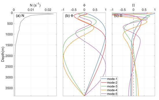 (a) Buoyancy frequency and normal modes (b) Φ and (c) Π of the first five baroclinic modes at 117.04° E, 18.48° N. Note that the normal modes shown in (b,c) have been normalized.
