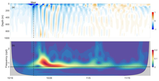 (a) HYCOM zonal currents at UIB6 (shading, unit: m/s) as a function of time and depth. (b) Continuous wavelet transform (shading, unit: m/s) of HYCOM zonal currents at 400 m depth at UIB6 as a function of time and frequency. The horizontal black solid line indicates the local inertial frequency. In (a,b), the vertical black dashed lines denote the time when Megi passed (00:00 on 22 October).