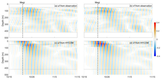 Comparison of (a,c) zonal and (b,d) meridional currents of NIWs (shading, unit: m/s) between (a,b) observations and (c,d) HYCOM reanalysis results at UIB6.The vertical black dashed line in each subfigure denotes the time when Megi passed (00:00 on 22 October).