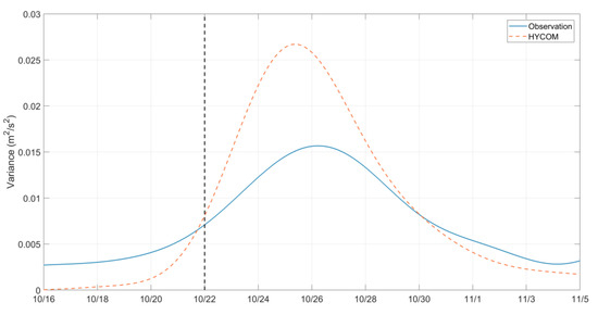 Comparison of lowpass filtered depth-averaged current variance of NIWs between observations (blue solid) and HYCOM reanalysis results (orange dashed) at UIB6. The vertical black dashed line indicates the time when Megi passed (00:00 on 22 October).