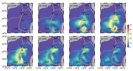 Figure 6 illustrates the depth-integrated NIKE from 18 October to 1 November with an interval of 2 days, from which the evolution of Megi-induced NIWs is detected. At 00:00 on 18 October when Megi’s center did not enter the SCS (Figure 1), slight NIKE was found to the west of Luzon Island (Figure 6a). At 00:00 on 20 October, when Megi’s center was at 117.3° E, 17.2° N in the SCS, Megi-induced NIKE reached 10–20 kJ/m2 and was mainly concentrated in two zones to the north and south of typhoon Megi, respectively (Figure 6b). From 22 to 26 October, strong NIKE with several hot spots exceeding 35 kJ/m2 appeared along Megi’s wake (Figure 6c–e). It should be noted that Megi had left the SCS Basin before 12:00 on 22 October and finally dissipated on 24 October, which means that the strongest NIKE appeared several days after the passage of Megi rather than under its influence. Thereafter, strong NIKE scattered (mainly westward propagated) and the NIKE along Megi’s wake quickly damped to below 10 kJ/m2 after 30 October (Figure 6f–h). According to [53], the ocean’s response to a typhoon in the northern hemisphere usually exhibits rightward biased features, i.e., larger sea surface temperature cooling, greater currents and deeper mixed layer appear to the right of the typhoon track. As shown in Figure 6, Megi-induced NIWs also exhibited apparent rightward biased features: the NIKE to the right of Megi’s wake was stronger than that to the left.