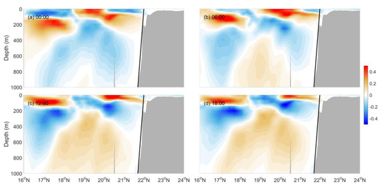 Meridional currents of NIWs (shading, unit: m/s) along 118° E at(a) 00:00, (b) 06:00, (c) 12:00 and (d) 18:00 on 24 October. The gray shading in each subfigure indicates the topography. The black solid line in each subfigure indicates the approximate topographic slope.