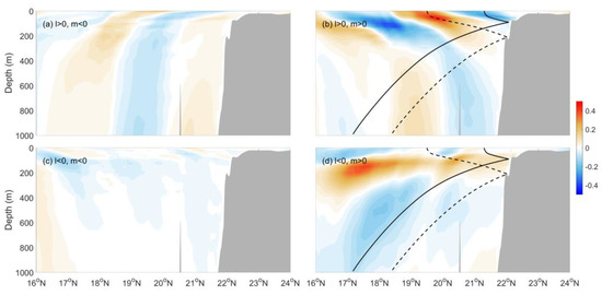 It is interesting to find from Figure 6 that Megi-induced NIKE was mainly concentrated in the deep SCS Basin where the water depth is greater than 1000 m (the gray curve in Figure 6), although typhoon Megi passed over both the deep SCS basin and shallow continental shelf and slope in the northern SCS. To investigate the possible cause of this phenomenon, Figure 7 illustrates several snapshots of meridional currents of NIWs along 118° E on 24 October. Similar results can be found at other meridional sections on the adjacent several days. From Figure 7, we can detect that the continental slope in the northern SCS is supercritical to Megi-induced NIWs, i.e., the topographic slope (the black solid lines in Figure 7) is apparently larger than that of NIWs. In other words, the NIWs impinging on the continental slope in the northern SCS would be reflected to the SCS Basin. However, due to the complex vertical pattern of NIWs shown in Figure 7, the reflection of NIWs is not visible. Therefore, we adopted the same method as [42,43] to separate the NIWs propagating in different directions. Figure 8 shows an example at 00:00 on 24 October. The NIW component with m > 0 (m represents the vertical wavenumber) dominates over that with m < 0, suggesting that the energy of Megi-induced NIWs mainly propagated downward, which is consistent with the above analysis and general features of typhoon-induced NIWs [49,50,51]. For the same m, the NIW component with l > 0 (l represents the horizontal wavenumber) is comparable to that with l < 0, suggesting that the northward-propagating and southward-propagating NIWs had comparable intensity. In order to study whether Megi-induced NIWs reflected on the continental slope, attention should be paid to the northward–downward (l>0 and m > 0) and southward–downward (l < 0 and m > 0) components (Figure 8b,d). According to Figure 8b, two northward–downward-propagating beams impinged on the continental slope in the northern SCS, which radiated from the surface at 19–20.5° N (positive sign) and 20.5–22° N (negative sign), respectively. At the same time, two southward–downward-propagating beams were found to radiate from the continental slope with different signs (Figure 8d). To demonstrate that the two southward–downward-propagating beams are the reflected beams of the two northward–downward-propagating ones, a simple ray tracing model [54,55] is adopted to qualitatively illustrate the propagating paths of NIWs. Given that reflection occurred in a small region near the continental slope in the northern SCS, the beta effect of Coriolis frequency and the influence of background currents were not taken into consideration. The ray tracing model [54,55] is described as
