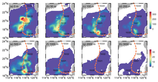 NIKE (shading, unit: J/m3) at (a) 0, (b) 50, (c) 100, (d) 200, (e) 500, (f) 1000, (g) 2000 and (h) 3000 m depth at 00:00 on 24 October 2010. Note that the range of colorbar for the upper and lower panels is different. Orange curves denote the track of typhoon Megi.