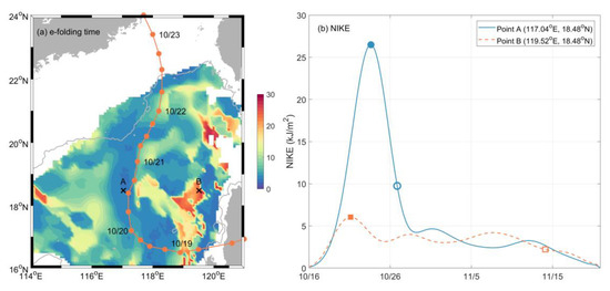 The damping of NIKE is an important characteristic of typhoon-induced NIWs [31,32,34,37]. To investigate the damping of Megi-induced NIWs, Figure 10a illustrates the e-folding time of depth-integrated NIKE. It is interesting to find that the e-folding time of Megi-induced NIWs was site-dependent and varied from several days to approximate a month. Along Megi’s track, Megi-induced NIWs damped quickly with the e-folding time generally smaller than one week; whereas away from Megi’s track, the e-folding time was longer. It is clearly shown that to the west of Luzon Island and the Luzon Strait, two remarkable zones exist where the e-folding time was longer than 20 days.