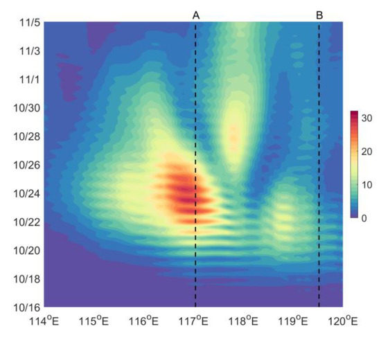 To explore the possible cause of different damping features of NIKE at points A and B, Figure 11 illustrates the depth-integrated NIKE along the 18.48° N section. As point A is nearly on Megi’s track, the NIKE near point A was the strongest along this section. With time going on, the NIKE at point A gradually propagated westward, which is consistent with the result shown in Figure 6. The NIKE at point A damped quickly with significant NIKE existing from 20 to 26 October. As for point B, because it is far away from Megi’s track, Megi-induced NIKE here was not significant and only lasted from 19 to 24 October. Thereafter, the NIWs initially generated at 118.8° E propagated eastward to point B and lasted to 1 November, which caused the fluctuations of NIKE at point B (Figure 9c). Similar results can be found at other points with long e-folding time. Based on these results, it can be concluded that the local long damping time of NIKE is related to the NIWs propagating from other sites.
