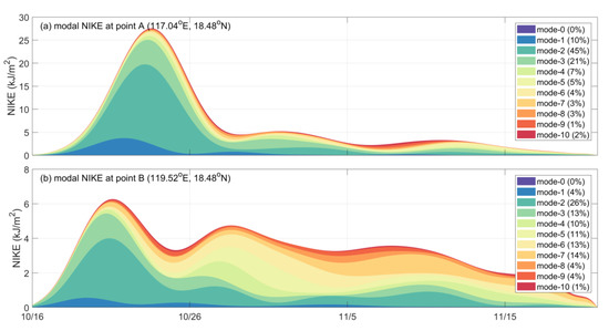 Modal NIKE at points (a) A (117.04° E, 18.48° N) and (b) B (119.52° E, 18.48° N). The values in the brackets indicate the proportions of modal NIKE in the total NIKE. Note that the modal NIKE has been lowpass filtered to remove oscillations at its own frequency.