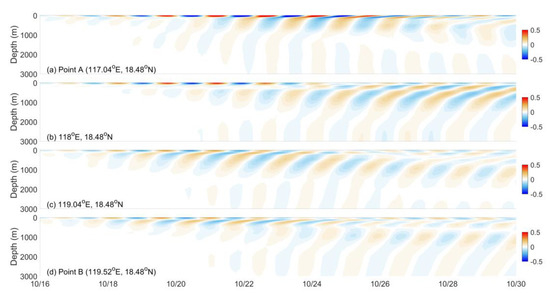 Zonal currents of NIWs (shading, unit: m/s) at (a) point A (117.04° E, 18.48° N), (b) 118° E, 18.48° N, (c) 119.04° E, 18.48° N and (d) point B (119.52° E, 18.48° N) from 16 to 30 October 2010.