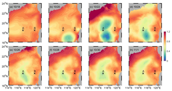 HYCOM surface elevations (shading, unit: m) at 00:00 on (a) 18, (b) 20, (c) 22, (d) 24, (e) 26, (f) 28 and (g) 30 October and (h) 1 November 2010.