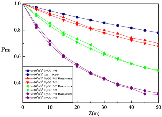 Furthermore, we compare the detection probability of the HyGG vortex beam and Laguerre–Gaussian (LG) beam under the same conditions using theoretical derivation method. We note that when the parameter p of the HyGG vortex beam is set to 0, LG beam with radial mode order 0 can be regarded as the special case of the HyGG vortex beam [30], the curves of detection probability for the two beams are coincide with each other as shown in Figure 1, and the same results can also be obtained for the other different parameters which we do not show repeatedly. From Figure 1, we can see that the evolution of detection probability using the numerical calculation based on theoretical derivation and the numerical simulation based on random phase screens model of oceanic turbulence bear a large proportion of consistency.