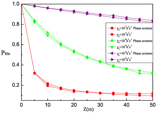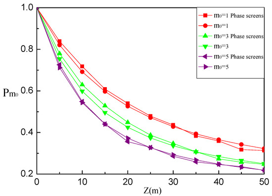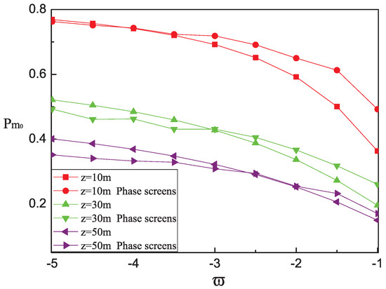 Figure 3 plots the evolution of the detection probability of the HyGG vortex beam as a function of the temperature-salinity contribution ratio of oceanic turbulence when the transmission distance z is 10 m, 30 m and 50 m. The value of ranges from −5 to −1, correspondingly from temperature dominance to salinity dominance. As indicated in Figure 3, is inversely proportional to for given z, which implies that the salinity fluctuation in turbulence is more influential to the propagation of the HyGG vortex beam than the temperature fluctuation. We note in Figure 3 that, when the transmission distance is less than 30 m and the value of is closer to −1, the evolution trend of detection probability obtained by the two methods is consistent with each other, but the value of bears a deviation. We think the main reason of this phenomenon is that the random phase screens of oceanic turbulence has the problem of insufficient sampling of spatial low frequency parts, and the salinity fluctuation has more influence on the random phase screens model when the beam transmission distance is small.