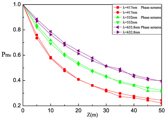 Next, we investigate the influence of initial beam source parameters on the propagation of the HyGG vortex beam through oceanic turbulence. Figure 4 and Figure 5 illustrate the behavior of detection probability as a function of z with different topological charge and wavelength , respectively. Because the radius of the beam rises up with the increase of topological charge, the values of the size of the receiving aperture for and are set as and when we carry out the numerical calculations with theoretical derivation. As Figure 4 shows, for given z, the detection probability is inversely proportional to . Compared with HyGG vortex beam with shorter , we can see from Figure 5 that beam with longer has higher detection probability . According to these results, an anti-turbulence effect enhanced is obtained for the HyGG vortex beam with smaller topological charge and longer wavelengt, which can be considered as the profitable parameter for beam transmission underwater. Meanwhile, we can also see from Figure 4 and Figure 5 that the results through numerical calculation based on theoretical derivation correspond with those brought about by numerical simulation based on random phase screens model of oceanic turbulence.