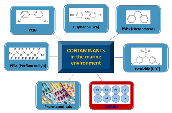 Many chemical contaminants, derived from human activities, are released into the marine environment causing serious damage to water and long-term effects on organisms due to chronic exposure [83]. The most common contaminants present in the microplastics in the marine environment are schematized in Figure 1.