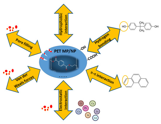 The surface sorption based on the electrostatic interaction arises when both MPs/NPs and organic or metal contaminants have opposite electric charges. The presence of polar groups on the adsorbent surface increases the electrostatic attraction between the hydrophilic domains of the contaminant molecules [132].