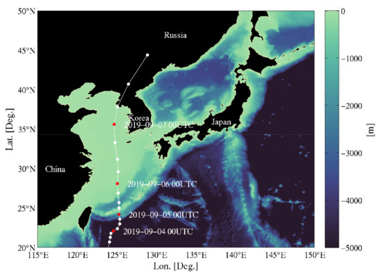 The best track of Typhoon Lingling provided through the Joint Typhoon Warning Center (JTWC), is shown in Figure 1. Lingling formed at 9 a.m. on 2 September 2019, on the sea about 560 km east of Manila, Philippines. At 3 p.m. on 5 September, it developed to a central air pressure of 940 hPa, maximum wind speed of 46 m/s, and wind radius of 390 km (east radius) about 320 km southwest of Okinawa, Japan. Then, it moved north from the East China Sea and passed the southern coast of the Korean Peninsula at 6 a.m. on 7 September 2019. It weakened as it moved north to northeast at a rapid pace on the western coast of the Korean Peninsula and transformed into an extratropical cyclone of 985 hPa from the land around 160 km northwest of Vladivostok, Russia at 9 a.m. on 8 September.