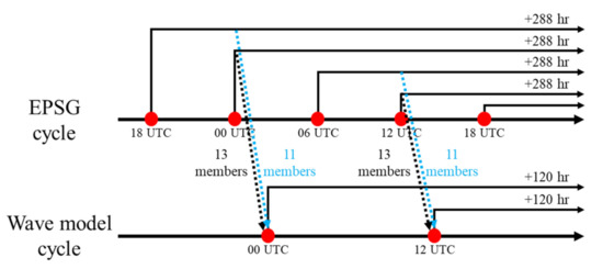 The overall operation diagram of the EPSG and ensemble wave forecast system is as shown in Figure 2, and the operation of the EPSG produced the sea surface wind of 11 members predicted 6 h in advance and the sea surface wind of 13 members predicted while the model was executed, including the control member by introducing the time-lag technique to prevent overloading of computing resources. The prediction was performed up to 240 h at 3-h intervals by using the produced sea wind prediction data of a total of 24 members as input data for the wave model.