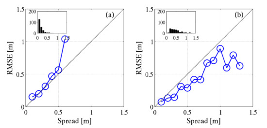 The rank histograms of lead times 00 h, 24 h, 48 h, and 72 h, respectively, are as shown in Figure 6a–d. The rank histogram up to a lead time of 24 h shows a U-shape with bias on the left and right, indicating that the ensemble does not spread out enough. After 24 h, it can be determined that the spread of the ensemble members is appropriate, because there was no bias with a flat shape, and that the range predicted by the model is reliable. The ensemble mean and spread were compared to determine whether the ensemble members could represent the actual event. The ensemble mean and the root-mean-square error (RMSE) of the observed data were calculated, and spread, which is the standard deviation of the members to the ensemble mean, was calculated through Equation (1) [27].
