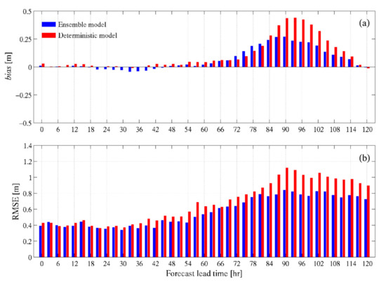 where, is the predicted value, is the observed value, and is the sample size. The results predicted up to 120 h at 3-h intervals in which the model was executed were compared with the significant wave heights observed in 17 ocean data buoys. In order to compare with the deterministic model result, averaged bias and RMSE values are calculated over all buoy observation points for each ensemble. As the result, both ensemble model and the deterministic model showed a tendency to over-estimation for the typhoon. The prediction error tended to increase when the lead time increased in both the ensemble model and the deterministic forecast model, as shown in Figure 8. The prediction error of the deterministic forecast model was particularly larger than that of the ensemble model, and the model tended to overestimate after 3 days of lead time. The ensemble wave model forecast performance for the significant wave height improved by approximately 18% in the RMSE in the 3-day lead time compared to the deterministic forecast model. In addition, it was confirmed that the typhoon intensity declined after 96 h of the forecast lead time, and the positive bias had decreased at the same forecast lead time. The time series of the observed significant wave height and the predicted data by both models at all buoy observation points were compared to determine the variations of bias and RMSE values, as seen in Figure 8. There are differences that were found in the prediction results of the wave model performed before and after the typhoon passed the buoy observation points. Overall, the model results predicted before the typhoon passed the observation points predicted that the maximum significant wave would occur earlier than the buoy observation, indicating that the positive bias and RMSE variations would occur later in the forecast lead time. Forecasting of waves conducted from the time the typhoon passed did not show significant differences between the predicted and observed values over the entire forecast lead time, and this difference seems to have reduced positive bias and forecast errors.