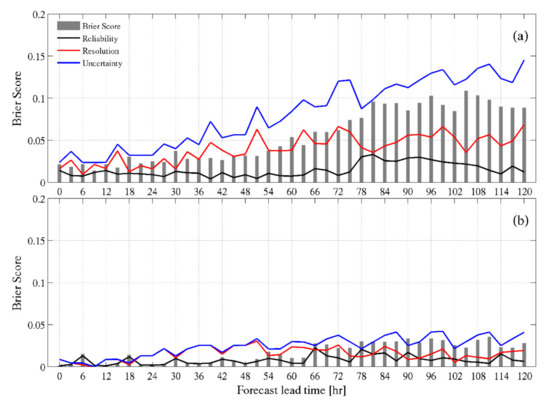 where is the number of forecasts for the actual event, and are the predicted probability and the mean of the observation frequencies in probability interval , is the number of samples of the forecast, and is the mean of the total observation frequencies. The first term represents reliability, which means how close the predicted probability is to the actual probability of occurrence. A reliability value of 0 indicates a perfect prediction. The second term represents resolution, which means how far the actual probability of occurrence is from the mean of the observed frequencies in different probability intervals. Finally, the third term is uncertainty, which means the uncertainty included in the actual phenomenon. It has no relation to the accuracy of the prediction probability, since it represents the difficulty of the prediction situation. The BS consists of these three terms and indicates that the accuracy of probabilistic prediction is high if the sum is close to 0. The total BS and element-specific values of the ensemble wave model calculated using Equation (4) is shown in Figure 9. The BS increased as the lead time increased, and although the occurrence probability decreased when the predicted significant wave height was large, the accuracy of the ensemble prediction was higher than that of the case where the predicted significant wave height was small.