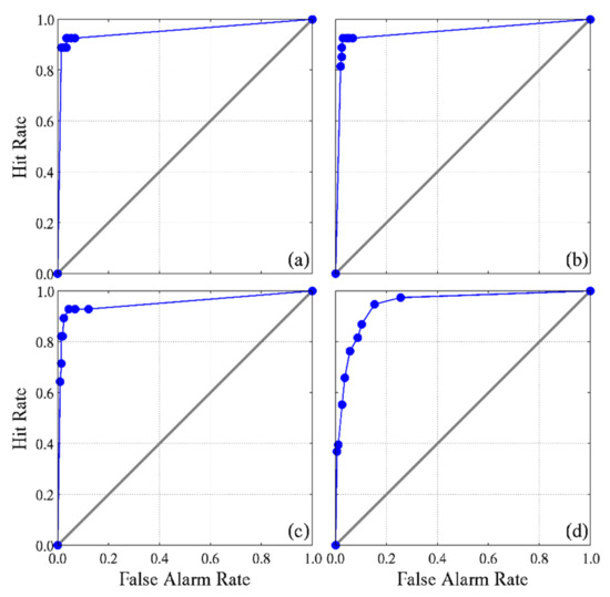 ROC with significant wave height of 2 m or above with forecasting lead times of (a) +00 h, (b) +24 h, (c) +48 h, and (d) +72 h.