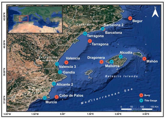 Wave and sea-level measurements from different buoys and tide gauges located along the Mediterranean Spanish coast were provided by the meteo-oceanographic network of Puertos del Estado [] and Instituto Geográfico Nacional [] (Figure 1). For the characterization of these storm events, the maximum significant wave height (Hsmax) and their associated peak period (TpHsmax) and wave direction (θHsmax), the storm duration (τ), and the sea level (η) were obtained. The wave height threshold used to estimate the storm duration was 1.5 m according to []. The considered zero sea level at each site was the mean sea level provided by the tide-gauge station.