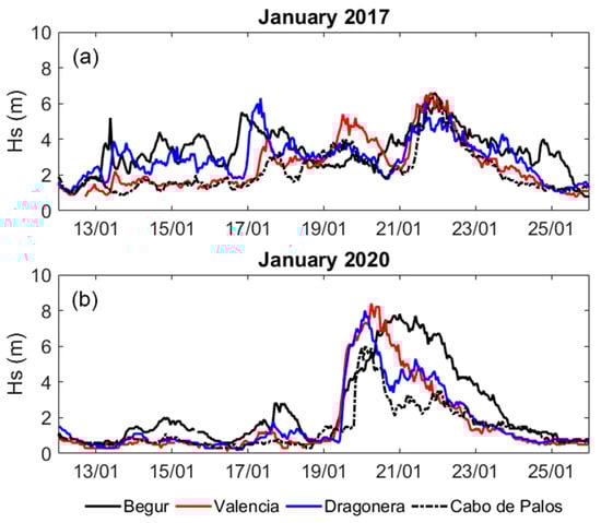 Temporal evolution of the significant wave height (Hs) (data from []) during the storms January 2017 (a) and January 2020 (b), in several buoys, i.e., Begur (black solid line), Valencia (red line), Dragonera (blue line), and Cabo de Palos (black dashed line). See Figure 1 for buoy location.
