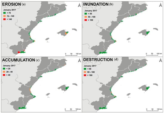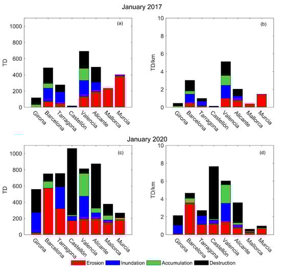 Globally, the January 2020 storm-induced damage along the Spanish Mediterranean coast was higher than that by the January 2017 storm, excepting in Murcia by far (Figure 3). The sum of the total damage (TD) was higher for the January 2020 storm (5459) than the January 2017 storm (2724). The greatest differences between damages were found in the destruction index, which had a score of 759 for the January 2017 storm, whereas the January 2020 storm achieved a value almost three times greater (2174). The damages were two times greater for erosion (1061 and 1811) and sand accumulation (244 and 509) and increased significantly for inundation (645 and 965) for the January 2017 and January 2020 storms, respectively.