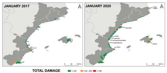The distribution of the overall reported damage along the study area is presented in Figure 4, according to the affected municipalities along the coast, as the smallest administrative unit with responsibilities in beach management (the affected area comprises 157 municipalities including beaches). Again, it can be observed that the coastal impacts of the January 2020 storm were more severe, affecting more municipalities (100) than the January 2017 storm (39). The province with more municipalities affected by both storms was Barcelona (11 by the January 2017 storm and 22 by the January 2020 storm), followed by Valencia (9 and 18, respectively). The most drastic change occurred in Castellón, where only one municipality was reported for the January 2017 storm and 15 municipalities for the January 2020 storm. Finally, Murcia was the only region where the municipalities affected by the January 2017 storm (3) were higher than by the January 2020 storm (2).