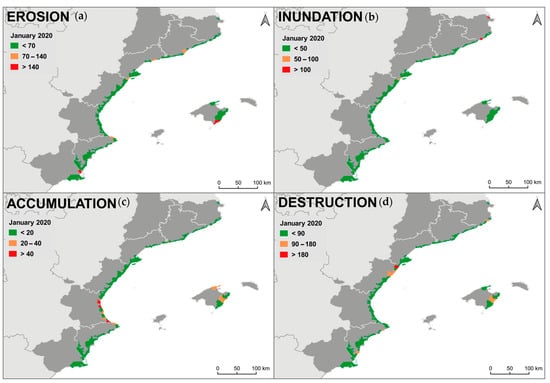 Focusing on the inundation, Valencia and Tarragona reached the maximum runup and inundation index during both events (Table 6). These conditions and the presence of low-lying areas (Ebro Delta in Tarragona and El Saler/Albufera in Valencia) favor large coastal flooding caused by extreme storm events that are also captured by the damage indexes. For instance, extreme coastal flooding of 3 km inland and overwashing of the sand barrier in the Ebro Delta were reported [] during the January 2020 storm, which is highlighted in the distribution map of inundation (Figure 6). Such coastal responses have also been identified for past extreme storm events in the area [,].