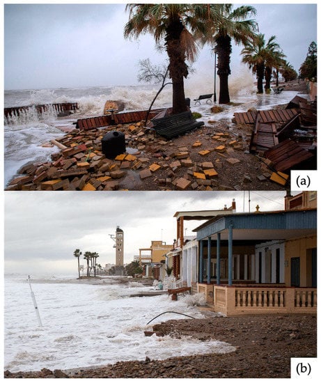During the last decades, there has been an increase in the impact of coastal hazards because of the high degree of coastal occupation and a reduction in sediment riverine inputs. In the future, the expected rise in sea level will make the coast one of the most vulnerable areas. For the 21st century, the predicted climatic change will increase storminess and sea level rise rates and a significant increase in coastal damage is expected []. According to the Intergovernmental Panel on Climate Change (IPCC) [], extreme coastal events with 100 years of recurrence period in the past could occur at least once per year at many locations by 2050 in all Representative Concentration Pathway (RCP) scenarios. Extreme storm events damage infrastructures and ecosystem services, and consequently have economic, social, and cultural impacts. Therefore, an adequate assessment of impacts caused by extreme storm events, as part of the strategy for evaluating coastal risks, is crucial and urgent to address the effects of climate change [].
