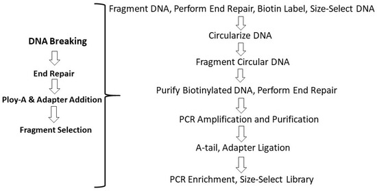The female tilapia (O. spilurus) subspecies was collected from seawater ponds at the Jeddah Fisheries Center on the Red Sea, Saudi Arabia. All experimental procedures were approved by the Unit of Biomedical Ethics Research Committee at King Abdul-Aziz University (Reference No. 653-20). Genomic DNA was extracted from muscle tissue using Qiagen Genomic Tip100 (Qiagen, Germantown, MD, USA). Three separate short-insert libraries and four long-insert libraries were constructed according to standard kit (Illumina, San Diego, CA, USA) protocols as outlined in the manufacturers’ instructions (Figure 1). The Illumina HiSeq platform was used for the whole genome shotgun sequencing strategy, using 125 bp paired-end sequencing reads. After quality control, DNA samples were fragmented by using a covaris sonicator. Libraries were constructed by end-repair, A-tailing, adapter ligation, and size selection. The constructed library was sent for PE sequencing on an Illumina HiSeq. The pipeline is shown as follows: The picture on the left is for library preparation for small fragment sizes (e.g., 230, 350, 500 bp). The picture on the right is for library preparation for large fragment sizes (e.g., 2, 5, 10, 20 k).