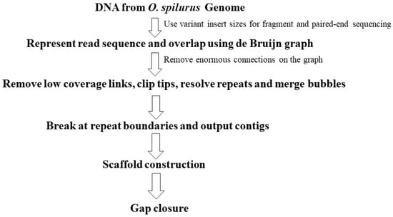 The distribution of k-mer abundance was used to estimate genome size, repeat structure, and heterozygosity rate from the WGS data [4]. We used the formula G = k-mer number/k-mer depth to estimate the genome size [5]. SOAPdenovo (v2.1) software was used to assemble the sequence reads. This software first builds sequence contigs from overlaps of the individual reads. Then, it uses the paired-end sequences with variant insert size (2, 5, 10, and 20 k) to build scaffolds of the sequence contigs (Figure 2). The genome assembly (SUB6140135) and raw reads (SRR9614879) were deposited by Mohammed O. Aljahdali, King Abdulaziz University, in the NCBI database with BioProject ID: PRJNA551931. The Oreochromis spilurus (BioSample SAMN12169131) whole genome shotgun (WGS) project has the project accession VSJB00000000 and consists of sequences VSJB01000001–VSJB01221829. The gene accession encoded number was GCA_008269305.1.