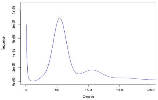 Frequency distribution of k-mer depth. X-coordinate is k-mer depth. Y-coordinate is the frequency of each k-mer depth.