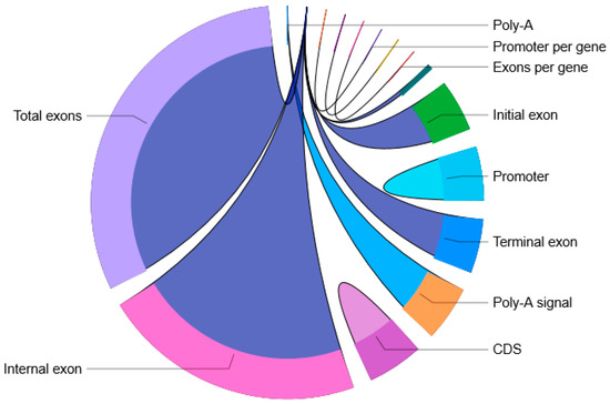 The circular graph shows that the total gene size with the predicted peptide sequences(s) was 51,642. The probability of suboptimal exons was mainly determined by a cutoff value of less than 0.10. However, the total number of exons was 350,181, whereas internal exons totalled 247,753. The initial and terminal exons totaled 49,704 and 50,077, respectively (Figure 4 and Table S1).