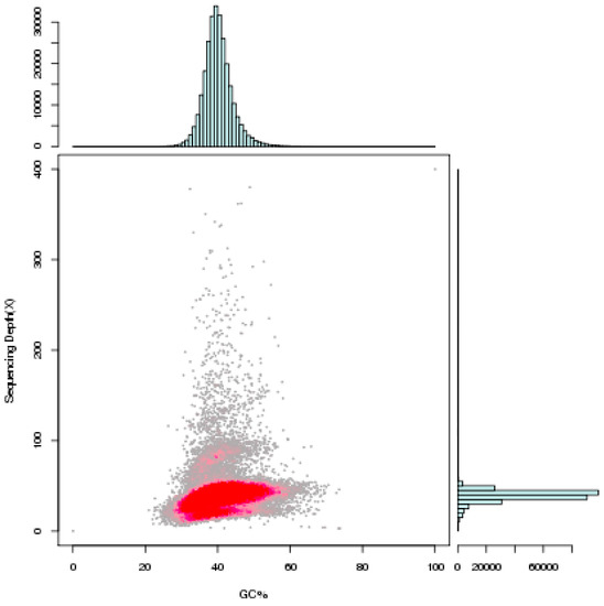 Correlation of GC content with sequence depth. X-coordinate is GC content, and Y-coordinate is average depth. The righthand section is the distribution of sequence depth. The upper section is the distribution of GC content. Red color represents high density where the genomic GC content was 40.4%.