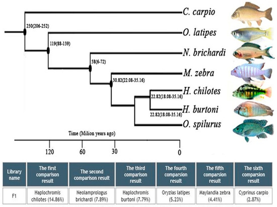 A random sampling of the data from 10,000 reads with higher quality was aligned with the NCBI nucleotide database (NT database) by BLAST. The top six species with high mapping rates were listed. After extracting one-to-one single-copy gene families, a phylogenetic tree was constructed. Seven protein sets of fish that included Cyprinus carpio, Maylandia zebra, Oryzias latipes, Haplochromis burtoni, Neolamprologus brichardi, and Haplochromis chilotes were downloaded from the popular Ensembl database. Molecular Evolutionary Genetics Analysis (MEGA X) was used to analyze each single-copy gene with the protein sequence of other species. The time tree shown was generated using the Realtime method. Divergence times for all branching points in the topology were calculated using the Maximum Likelihood method and Tamura–Nei model. The divergence of O. spilurus from six other fish is predicted to have started form about 22.82 million years ago (Figure 6).