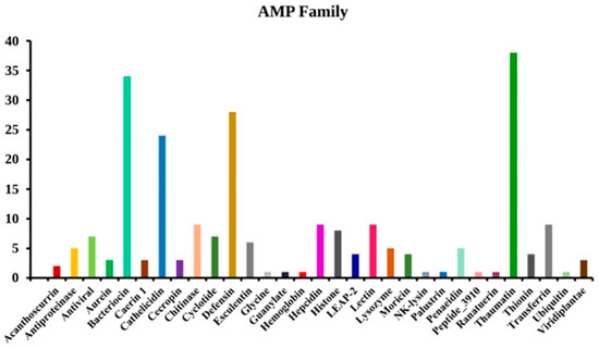 A total of 262 putative AMP genes were identified from the O. spilurus by using a local reference database (Table S5). For high–throughput identification of antimicrobial peptide, we employed BLAST to search an annotated gene set of O. spilurus. This covered 31 families where thaumatin was the highest in number (Figure 7). Cathelicidins are a diverse group of AMPs that are effective against bacteria, fungi, and viruses and have a high tolerance to salt. In the study, 22 cathelicidin AMPs were documented among the 262 AMPs.