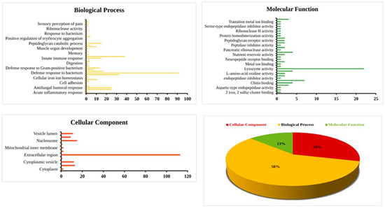 GO enrichment analysis predicted that the 262 putative AMP genes from O. spilurus were enriched to 622 pathways through the cellular components (29%), biological process (58%), and molecular function (29%). Therefore, it interacted with different categories of acute and chronic diseases with the main classes related to immune function and diseases. The included AMP families have separate activities such as antimicrobial, antibacterial, antifungal, antiviral, and antitumor activities (Table S5 and Figure 8).