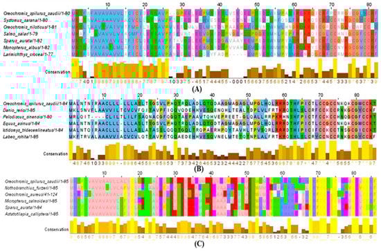 Hepcidin is an essential peptide in fish bodies partially responsible for antibacterial, antifungal, and antimicrobial activities. The number of hepcidin family AMPs in O. spilurus was compared with the number in other fish through multiple alignment. Hepcidin shows a >50% similarity of conserved sequences with other fishes (Figure 9A). Hepcidin (Query ID: CAMPSQ5019) has a strong antimicrobial activity as proved by the study of Vibrio vulnificus and Staphylococcus aureus from the orange-spotted grouper. Hepcidin antimicrobial peptide (Query ID: CAMPSQ2170) has a great role to play in activating innate immunity against bacteria, and similar activities are observed in bony fish studies of gilthead seabream. This hepcidin antimicrobial peptide has not been documented until now in any other Oreochromis spp., which have shown a >50% similarity of conserved sequences compared with other fishes (Figure 9B). Finally, a hepcidin-like antimicrobial peptide (Query ID: CAMPSQ6966) was shown to play an active role against Gram-positive bacteria (Listeria monocytogenes and Enterococcus faecium) in a study of Mozambique tilapia (Oreochromis mossambicus). This putative hepcidin gene was identified by multiple sequence alignment where it showed a >80% sequence similarity compared with other fishes (Figure 9C).