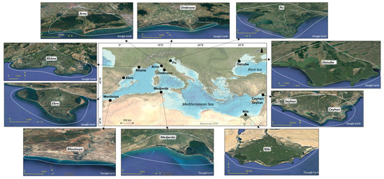 Map of the Mediterranean and Black Sea showing the ten river deltas selected for this study, and Google Earth images of each delta, with delimited buffers for the determination of land-water changes. The Ceyhan and Seyhan are considered here as a single delta.