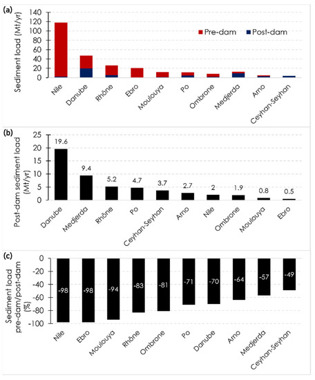 Mediterranean deltas range from a few km2 in area, associated with small catchments (tens to hundreds of km2), to major multi-branched constructions at the mouths of the larger rivers, the most important of which are the Danube, the Po, the Nile, the Ebro, and the Rhône (Figure 1). The history and development of deltas in the Mediterranean basin, one of the cradles of civilization, has been strongly intertwined with the waxing and waning of cultures and societies and major climatic and economic changes over the last six millennia [9]. Anthropogenic pressures have been exerted on Mediterranean river catchments and deltas, notably via mediation of fluvial sediment flux, and these rivers are, today, among the most fragmented on Earth, with significant levels of loss of connectivity [10]. Sediment flux is an overarching component of management and conservation of coastal and deltaic systems, as sediments form the foundations for delta growth, mitigate natural subsidence, and enable delta sustenance in the face of sea-level rise. Some of the characteristics of the ten selected deltas are shown in Table 1. Many of these deltas are linked to river catchments that have been dammed over the last few decades, leading to significant reductions in fluvial sediment loads [8,11]. None of the river catchments feeding the ten deltas selected for this study have been spared by sediment reduction, caused mainly by dams (Figure 2).